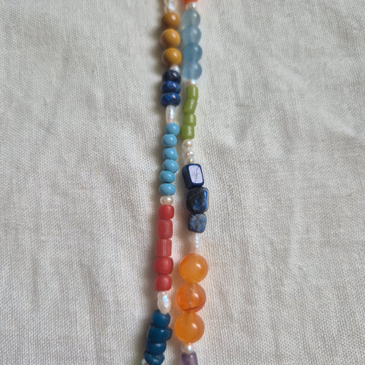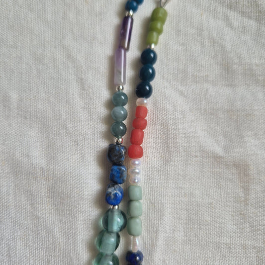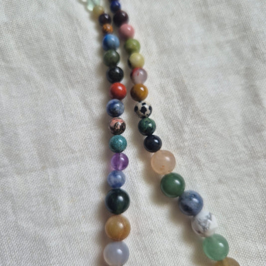 A small batch of ten bead necklaces, made using a thoughtfully collected selection of beads.