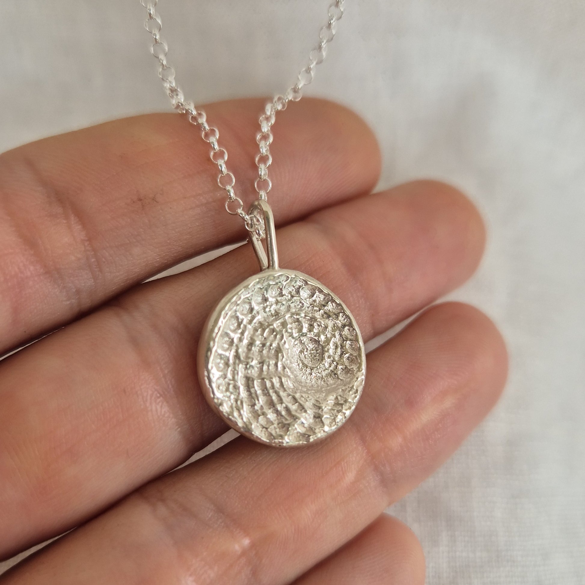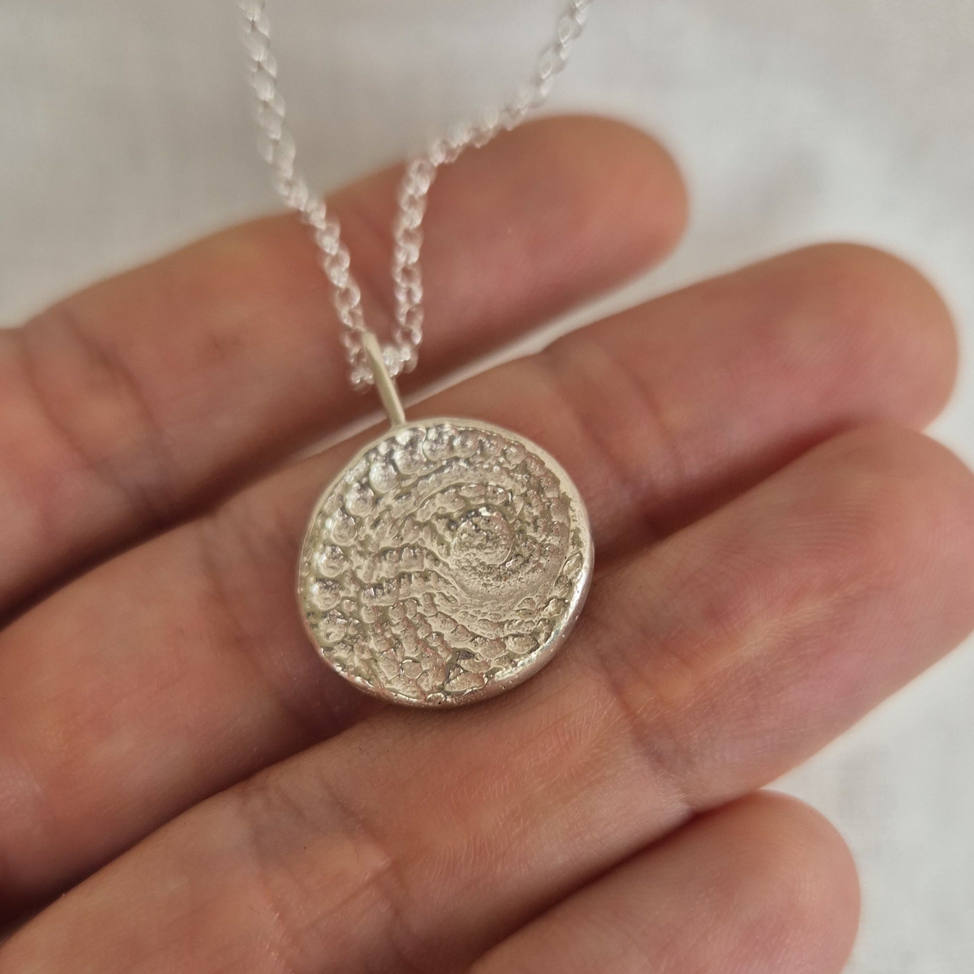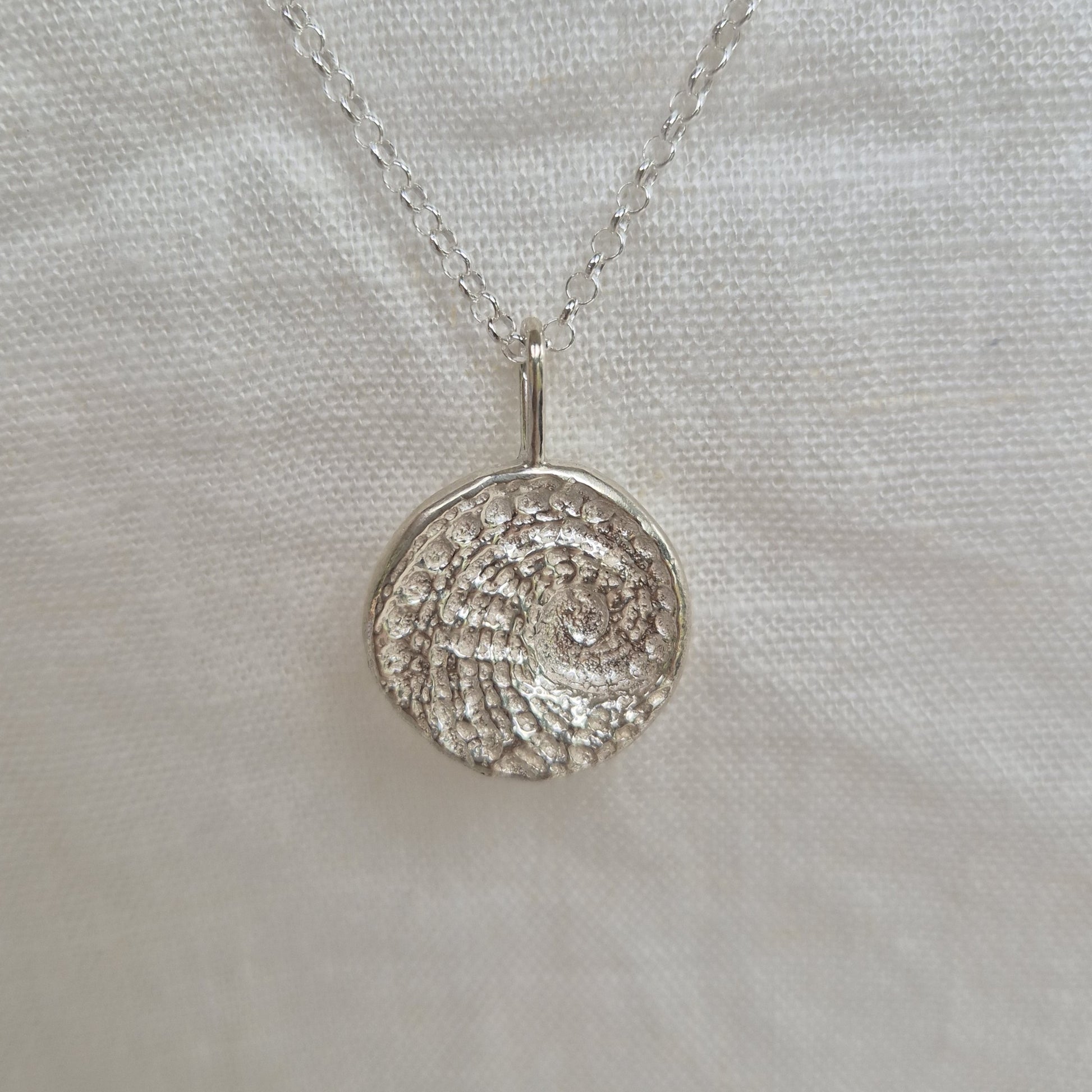 Sandcast in solid sterling silver from a mould I created using an abalone shell, this pendant captures the natural curves and layered texture of the original form. A small coastal keepsake with soft organic detail and a solid, sculptural feel.