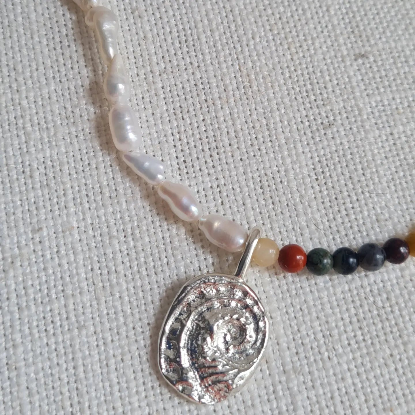 Discover the elegance of this Beaded Silver Abalone necklace. Featuring a Sandcast Sterling Silver pendant, showcasing the captivating textures of abalone shell.
