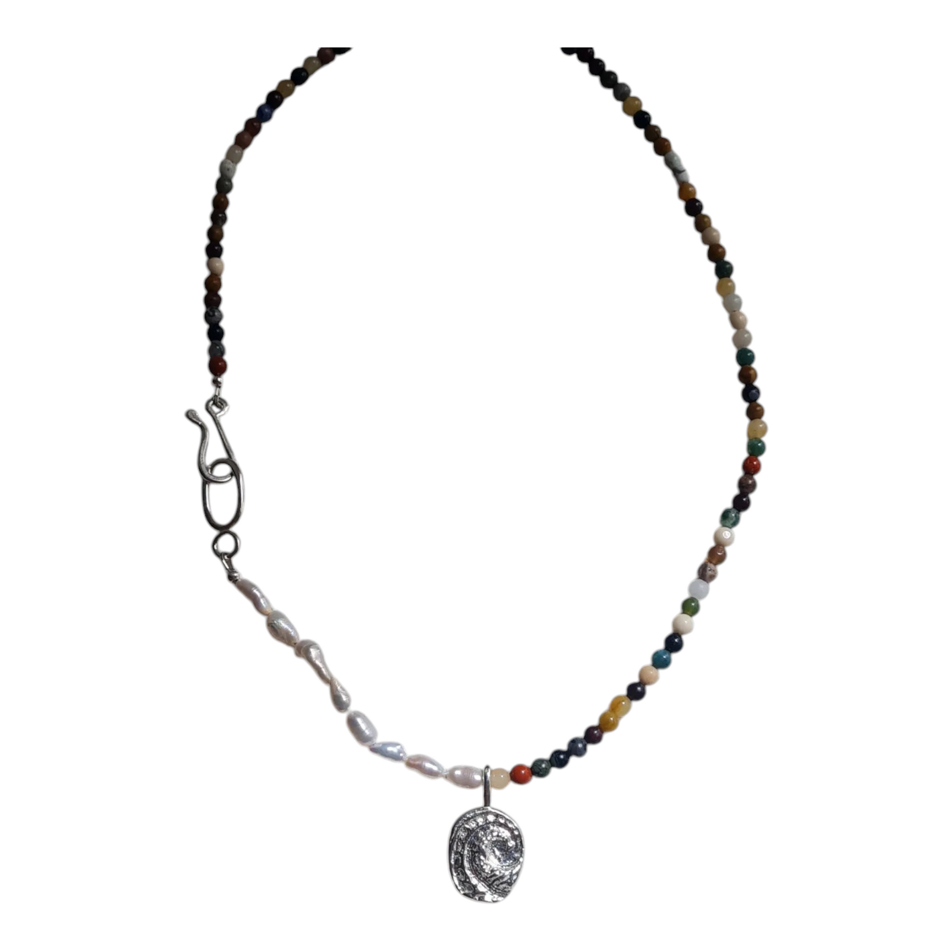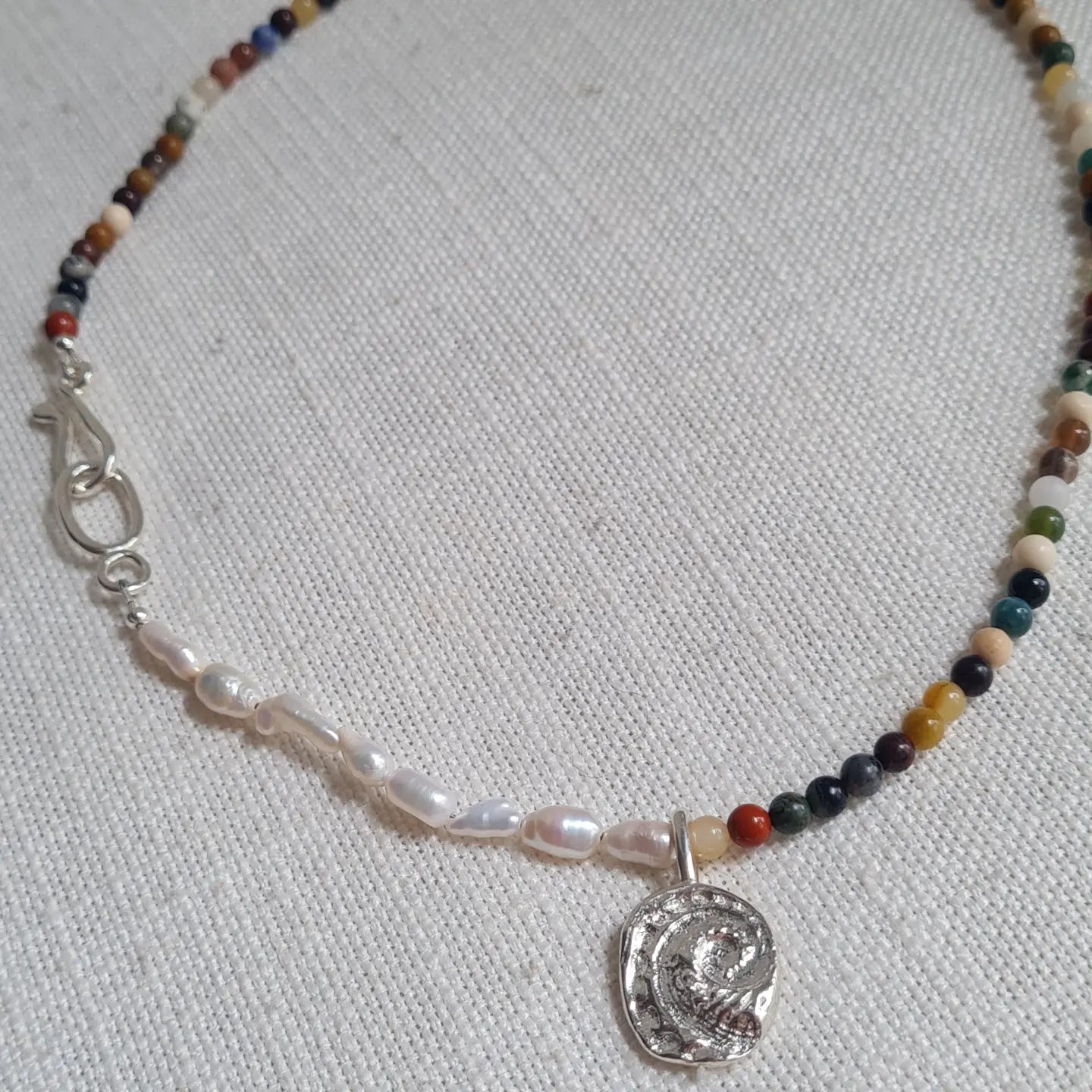 This exquisite piece features a harmonious blend of 4mm gemstone beads—Red Jasper, Howlite, Rose Quartz, Sodalite, Clear Quartz, Jade, Tiger Eye, Lapis Lazuli, Dragon Bloodstone, Zebra Jasper, and Map Jasper to name a few —along with 4-6mm freshwater Biwa pearls.
