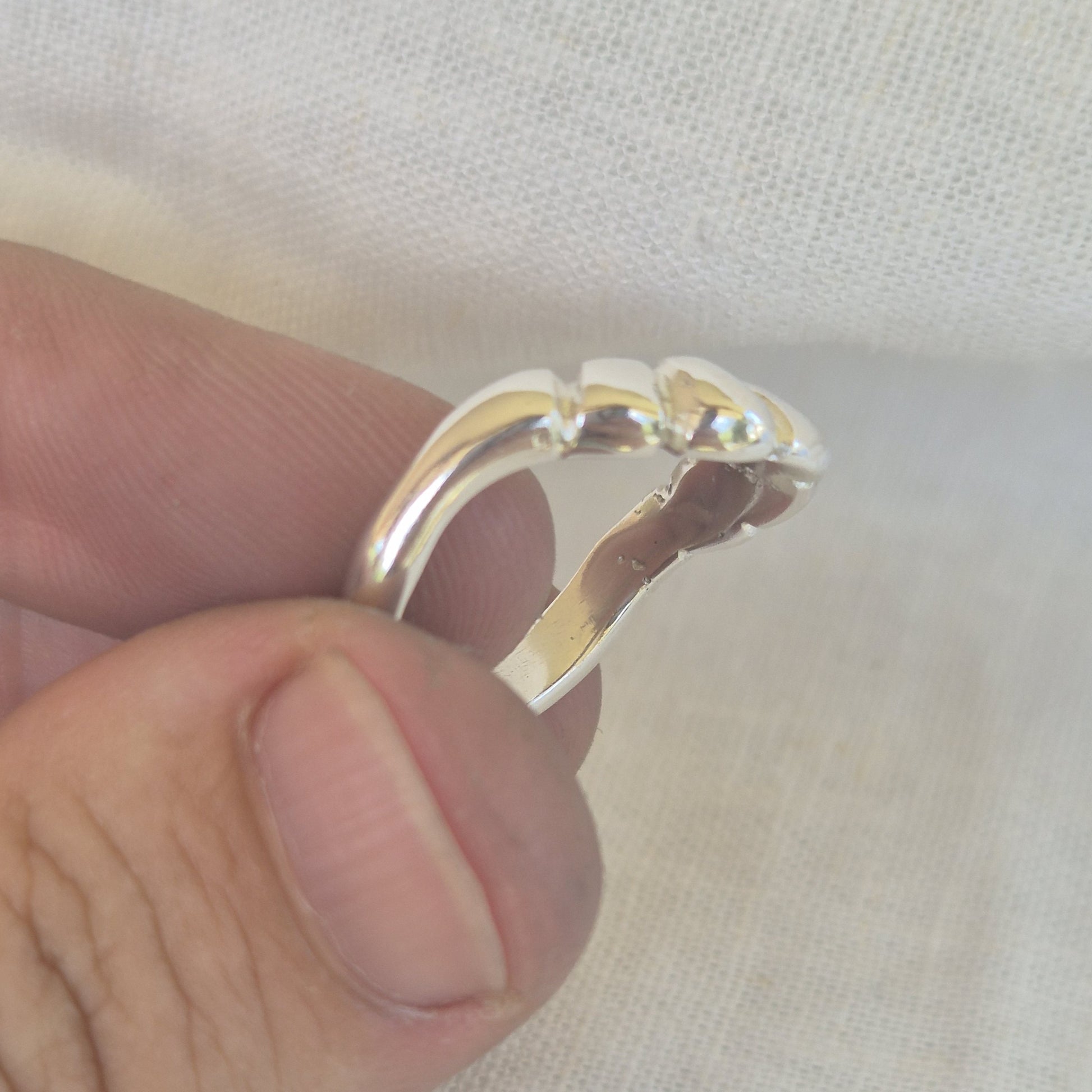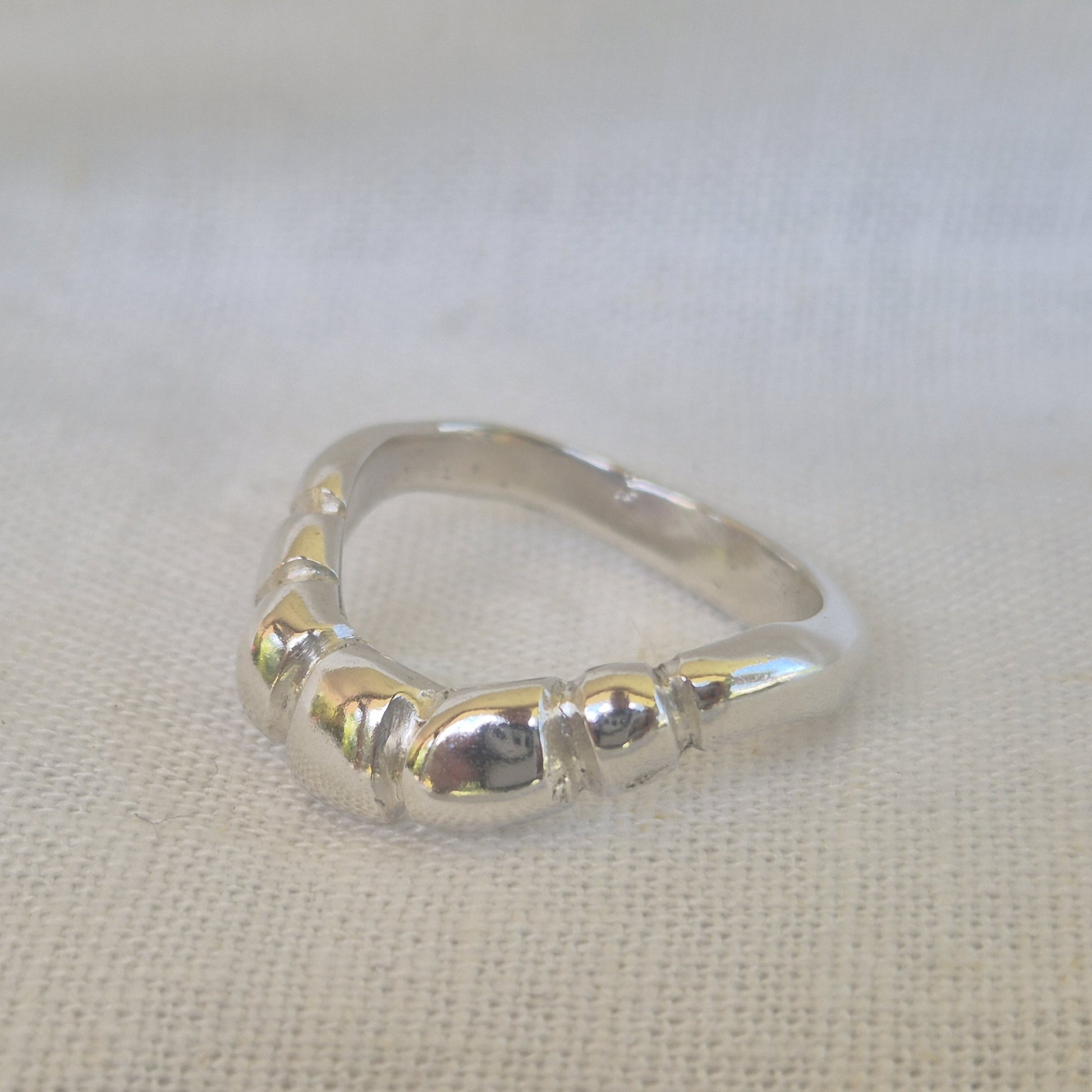A variation of the Tidal Flow style, this ring features a soft U-shaped curve at the top with the rest of the band finished in a smooth high polish. Sandcast individually, each one forms its own subtle markings and organic shape, making every ring completely unique.