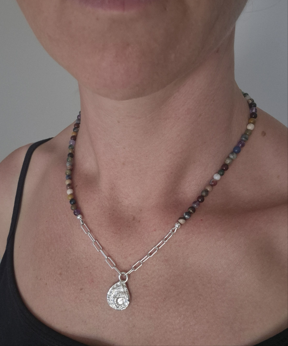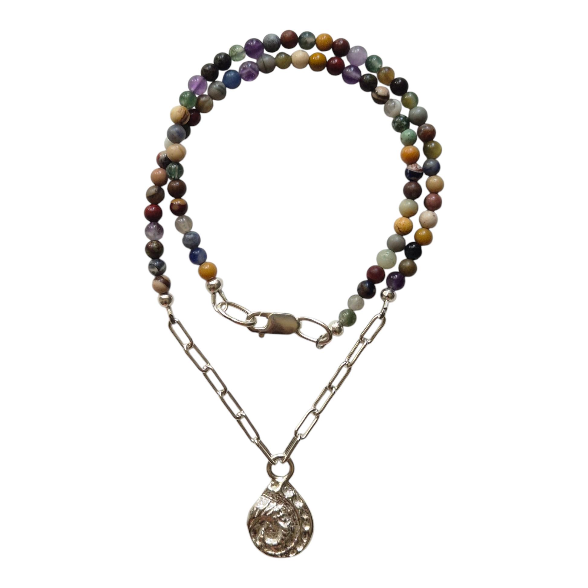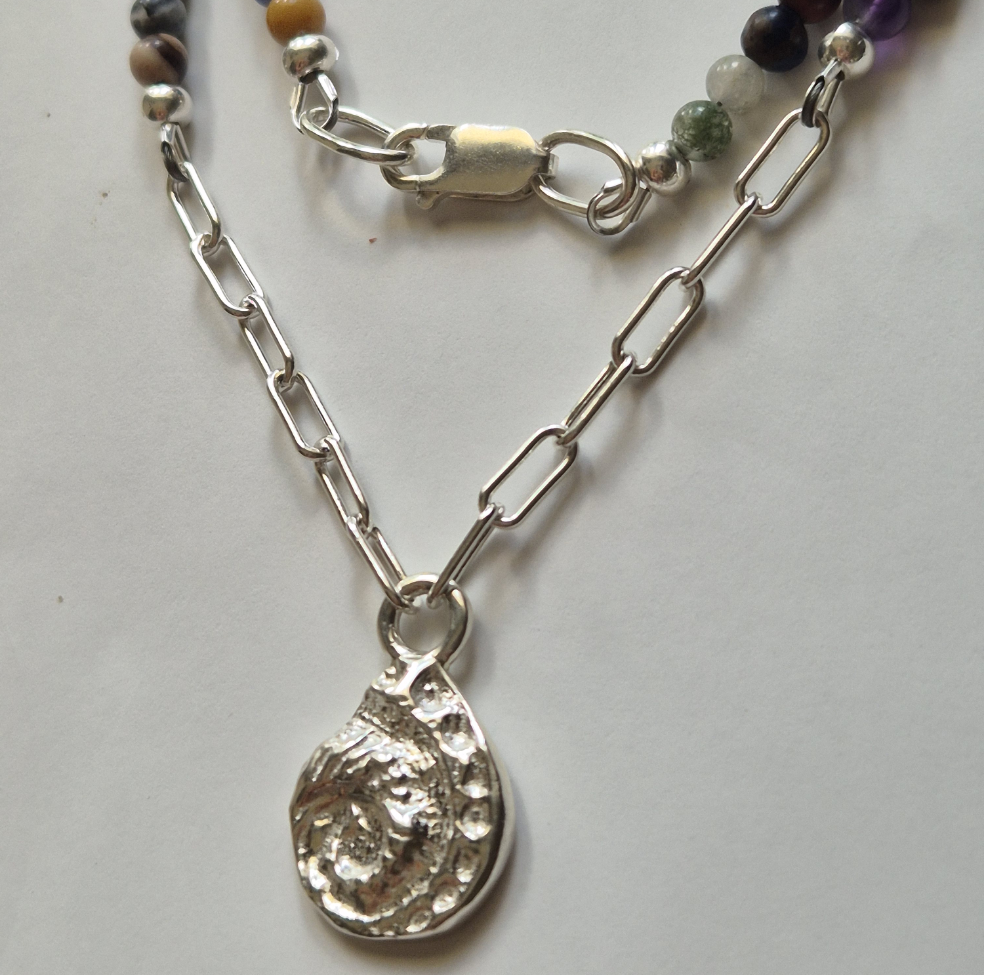 Abalone Shell Pendant & Gemstone Necklace. This piece features a solid sterling silver sandcast abalone shell tear-drop pendant, surrounded by a vibrant array of mixed semiprecious gemstones, connected together with a sterling silver paperclip chain.