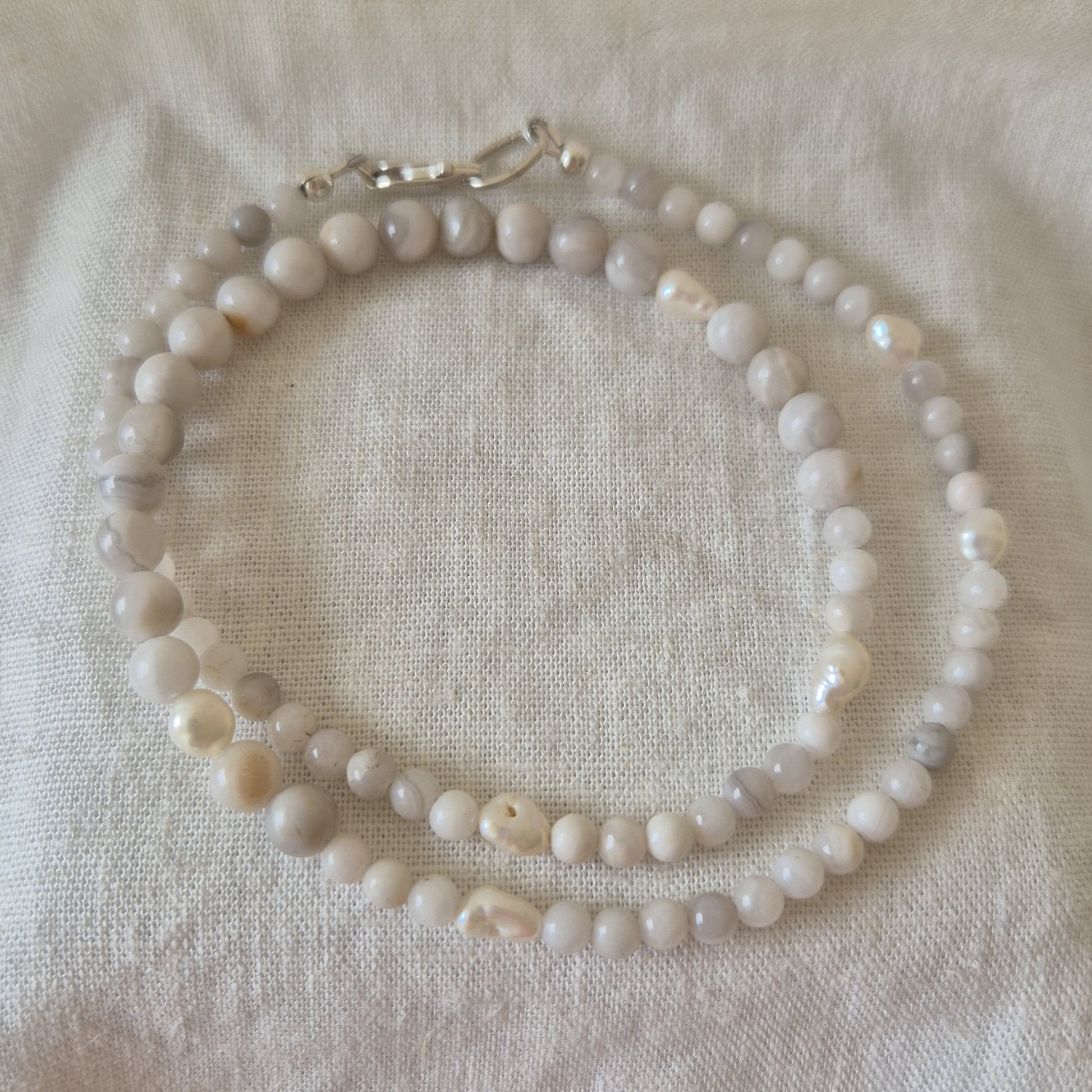 A soft, natural blend of white crazy lace agate and lustrous keshi freshwater pearls, arranged in a gentle ascending gradient from 4 mm to 6 mm. The mix of smooth stone and organic pearl shape creates a refined, earthy palette with subtle texture and movement.