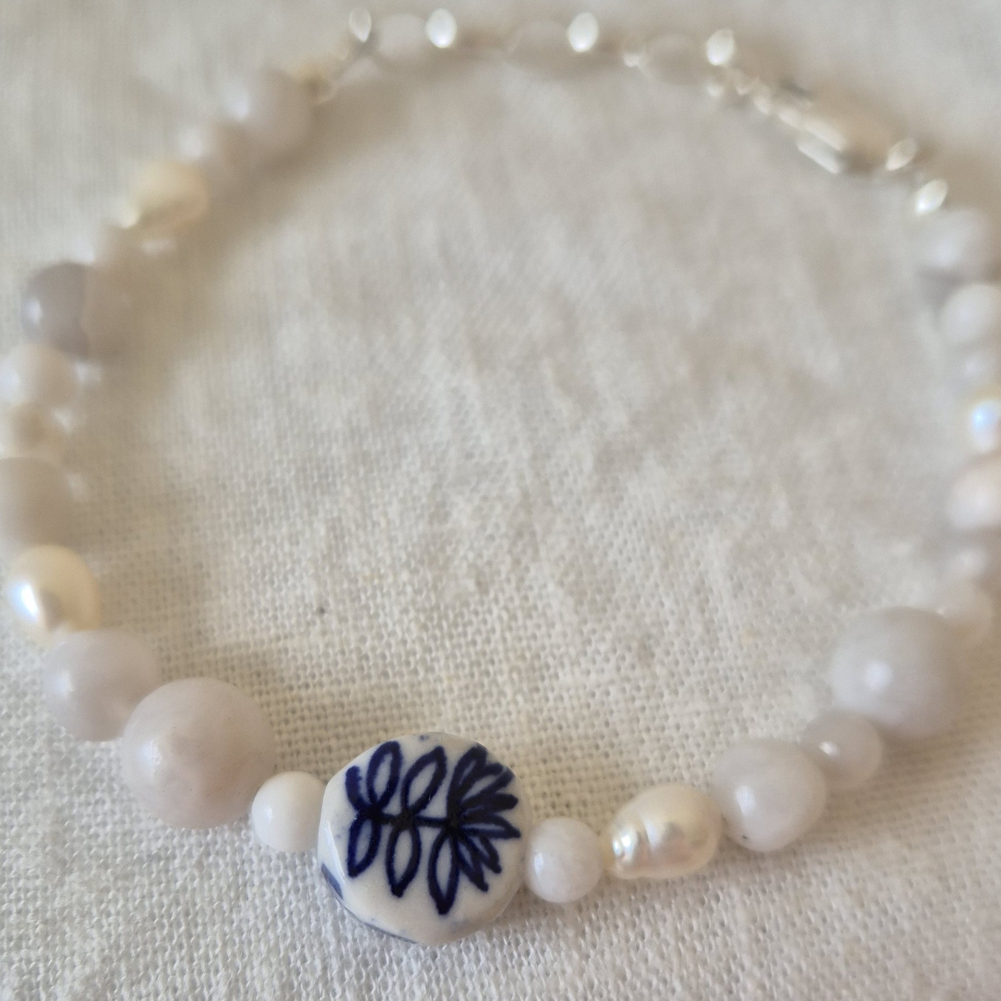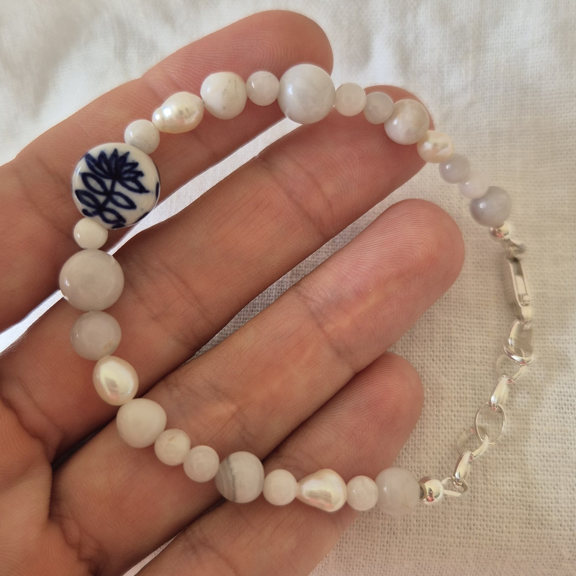 A gentle mix of white crazy lace agate and freshwater pearls, finished with a single ceramic accent bead for a subtle pop of texture. Soft, natural tones make this bracelet an easy everyday piece - perfect on its own or layered in a stack.