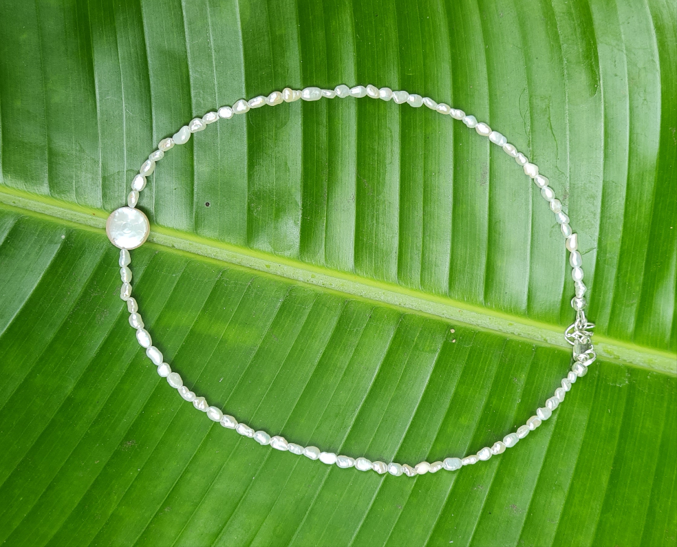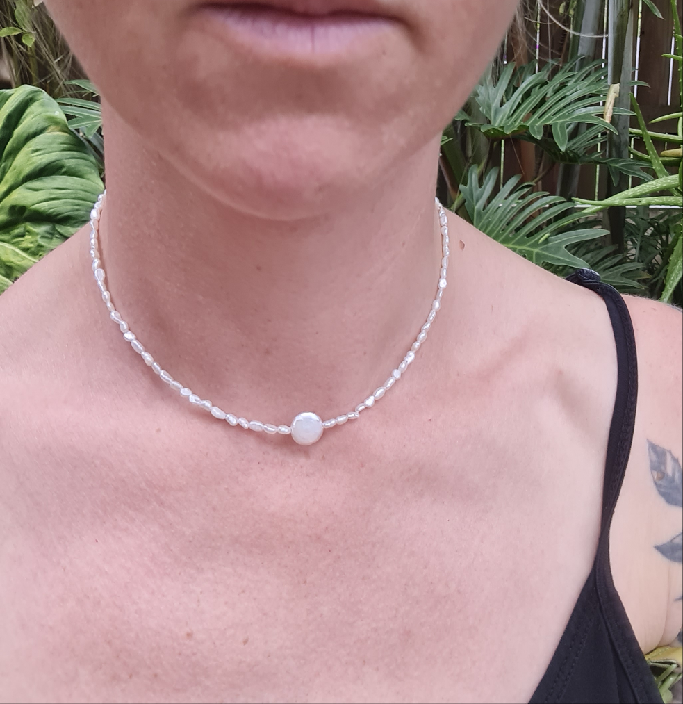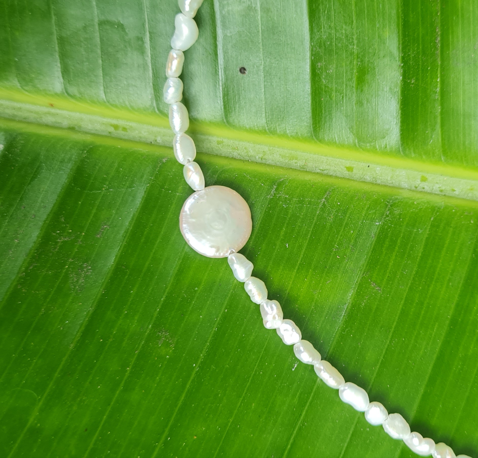 Handcrafted Keshi freshwater pearl choker, featuring a stunning coin pearl as its focal point. Keshi pearls are selected for their unique and irregular shape in this necklace. The central coin pearl adds a touch of sophistication, beautifully balancing the organic appeal of the Keshi pearls.