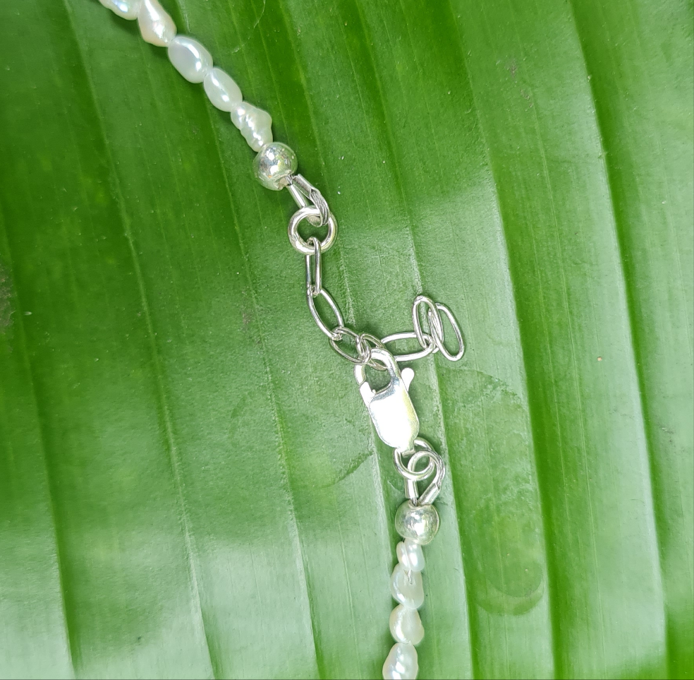 Materials: Keshi freshwater pearls, coin pearl, sterling silver extender chain and clasp