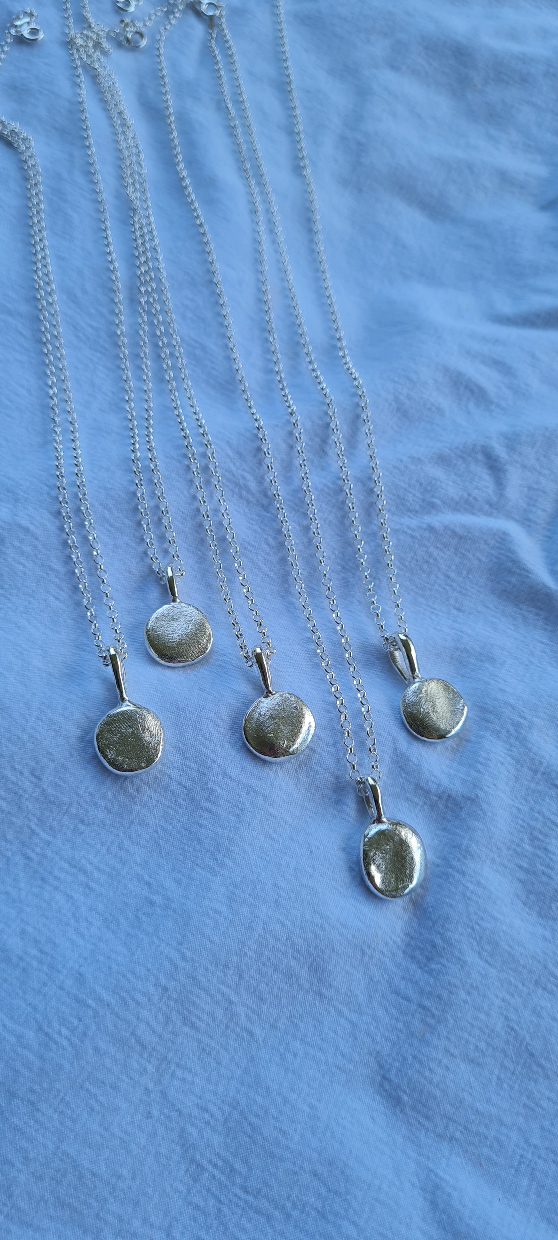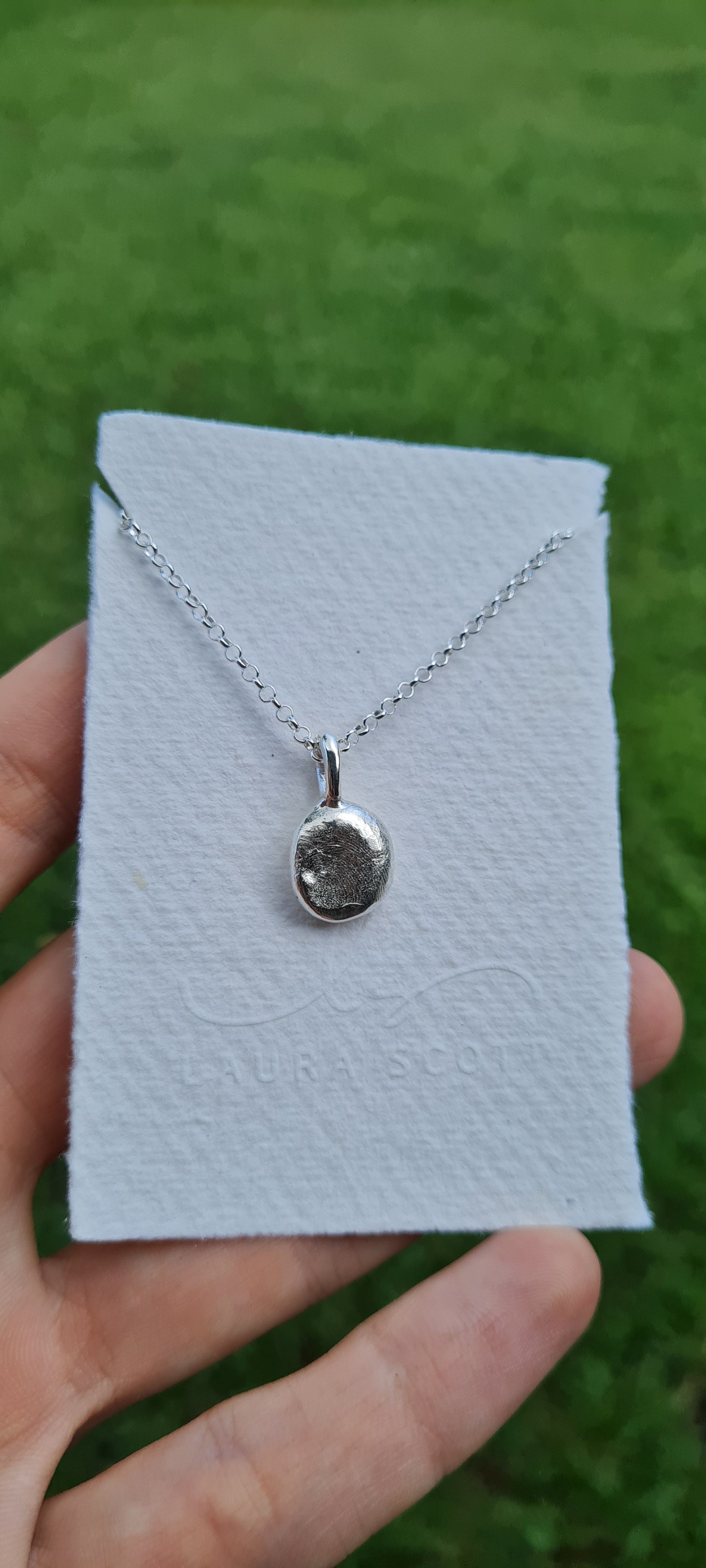 Solid sterling silver pendant with your own unique impression, choose between pendant only or your desired length of chain.