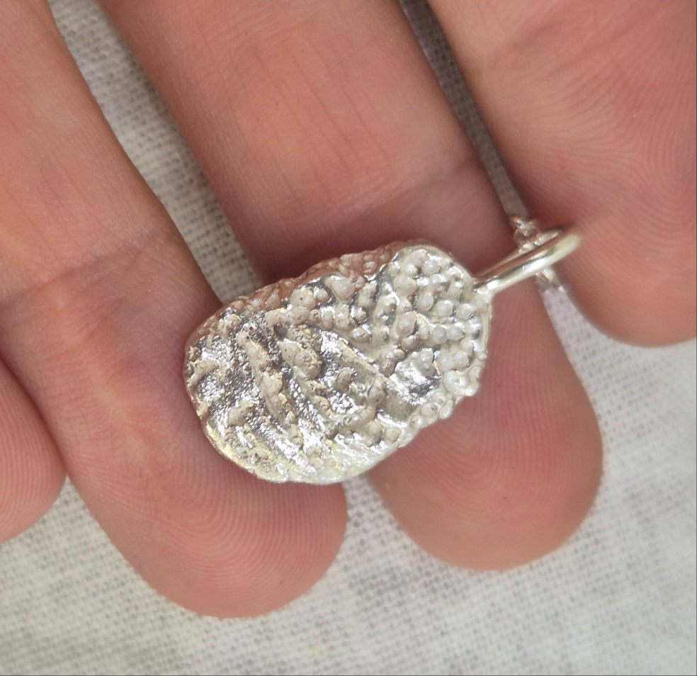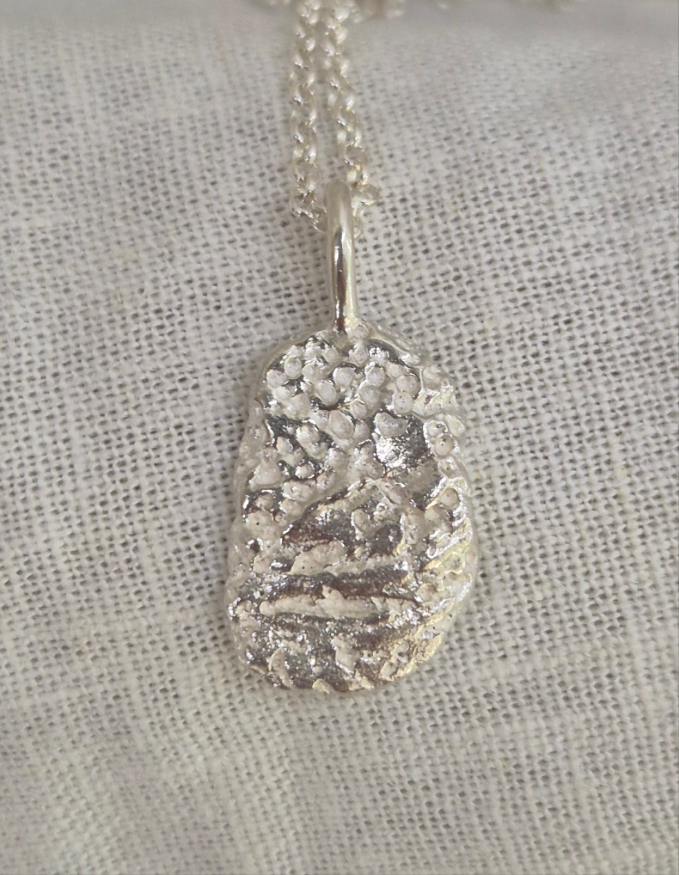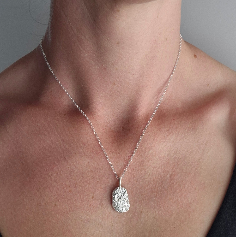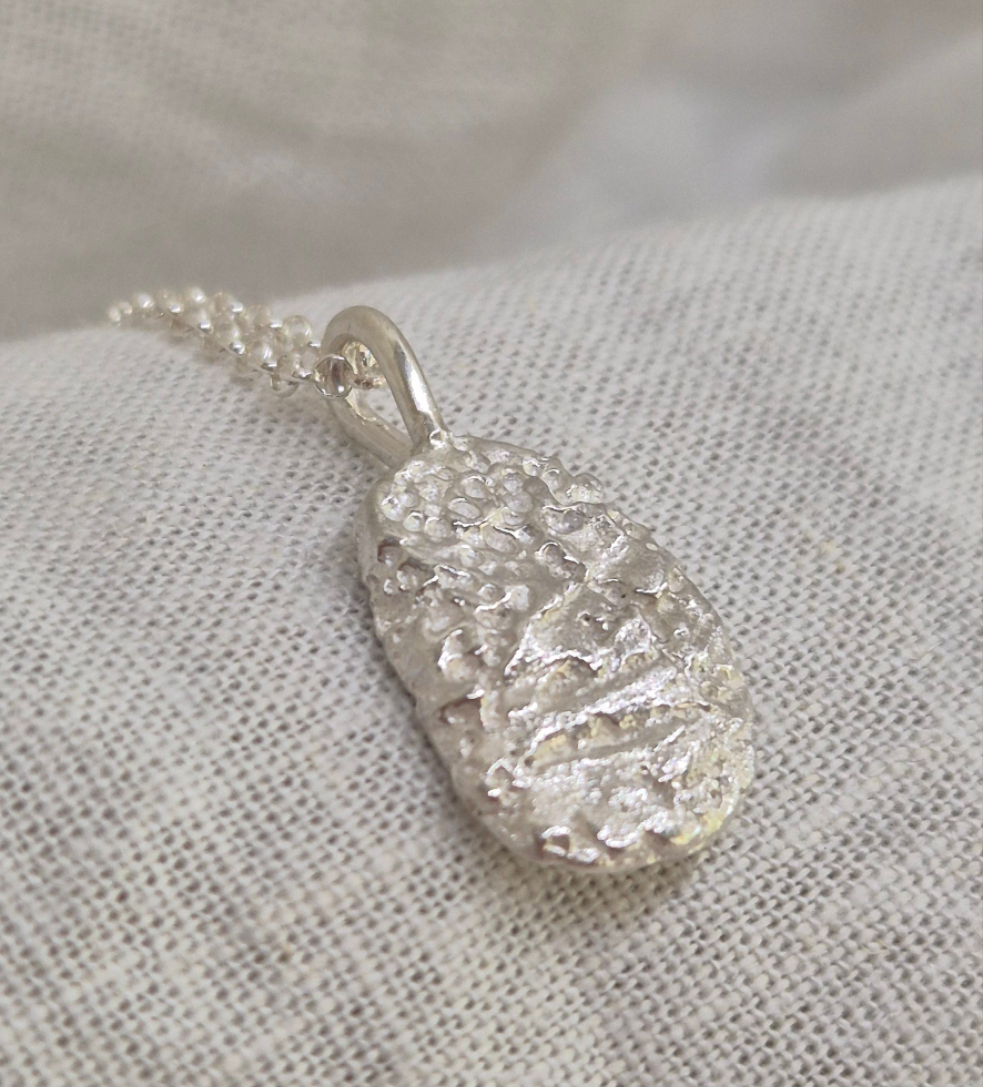 Sandcast in solid sterling silver, this pendant captures the natural beauty of a real seashell fragment. The piece holds the rough organic textures that echo the ocean it once came from, making it a timeless keepsake of the sea.