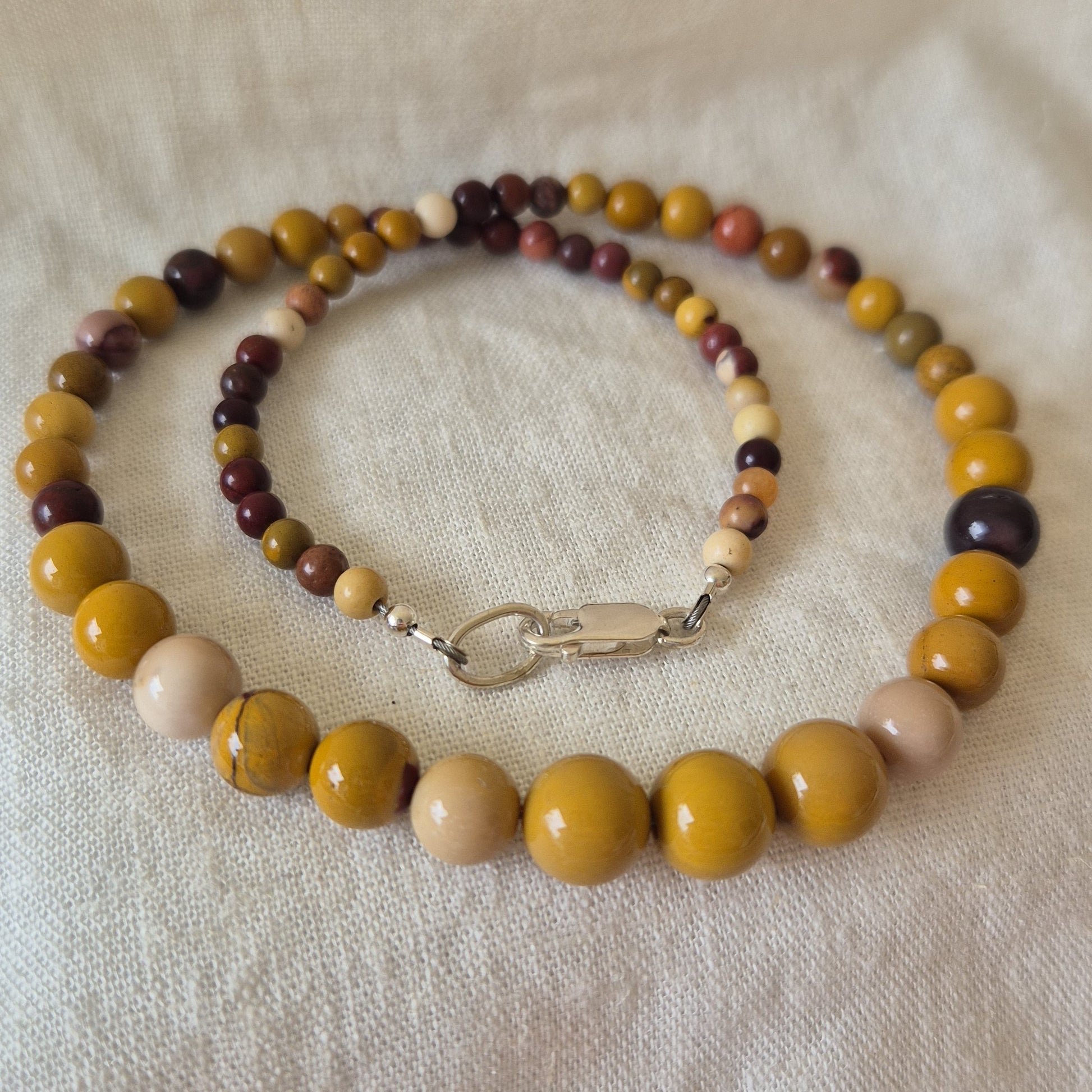 A warm blend of natural mookaite gemstones, arranged in a gentle gradient from 4 mm to 8 mm. Each bead carries its own earthy tones.