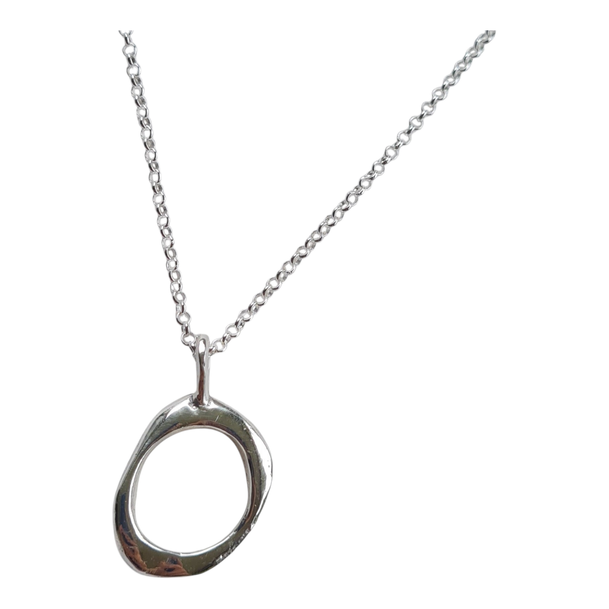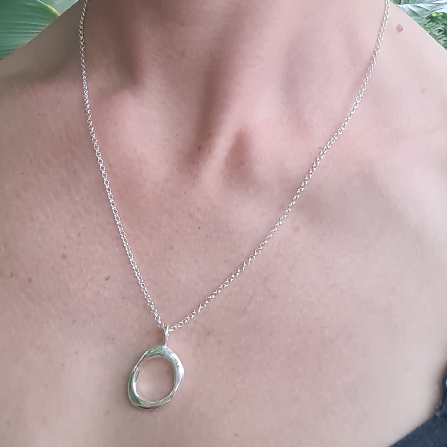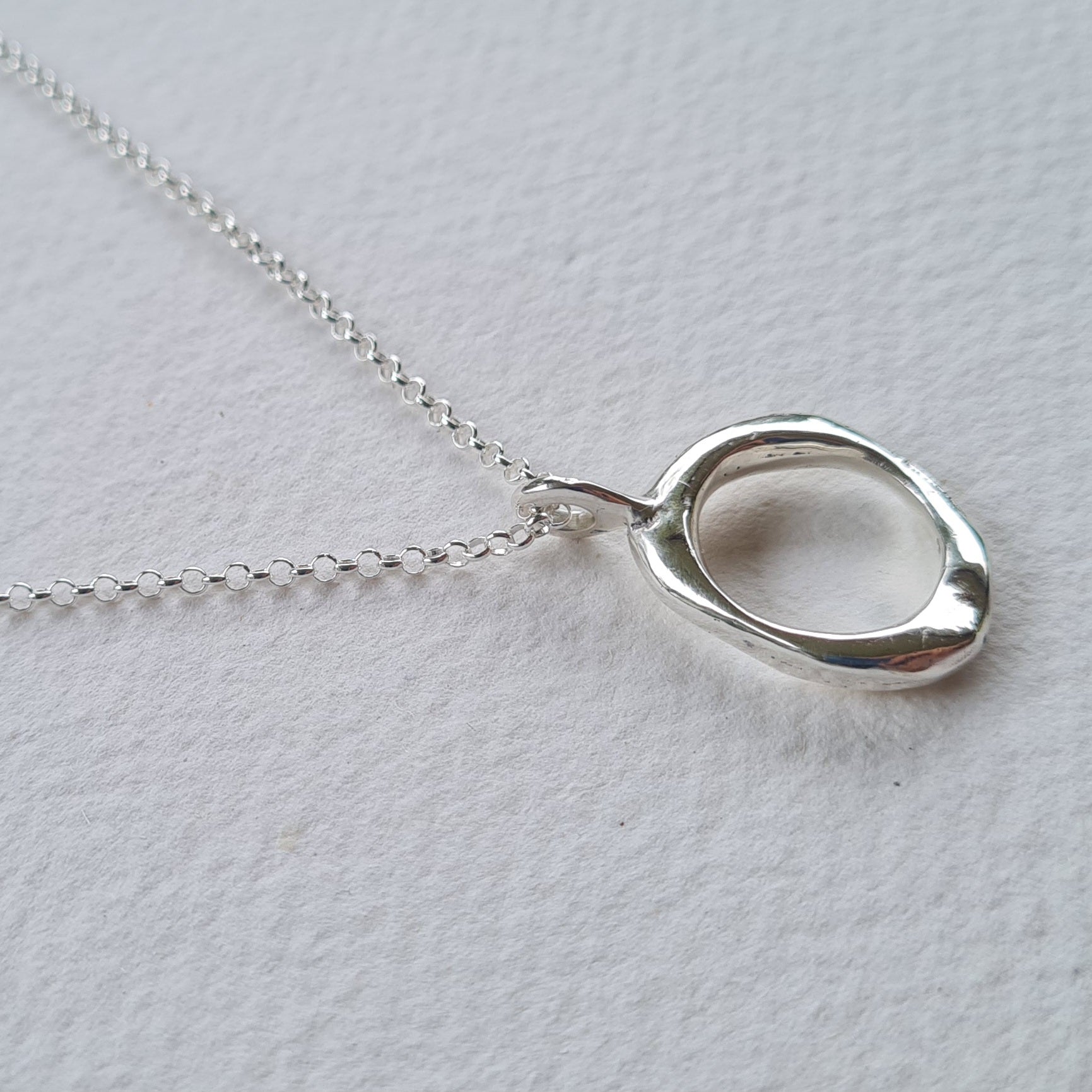 Introducing the exquisite organic loop sandcast pendant, meticulously crafted in solid sterling silver. This pendant boasts an organic ring shape with an attached bail.
