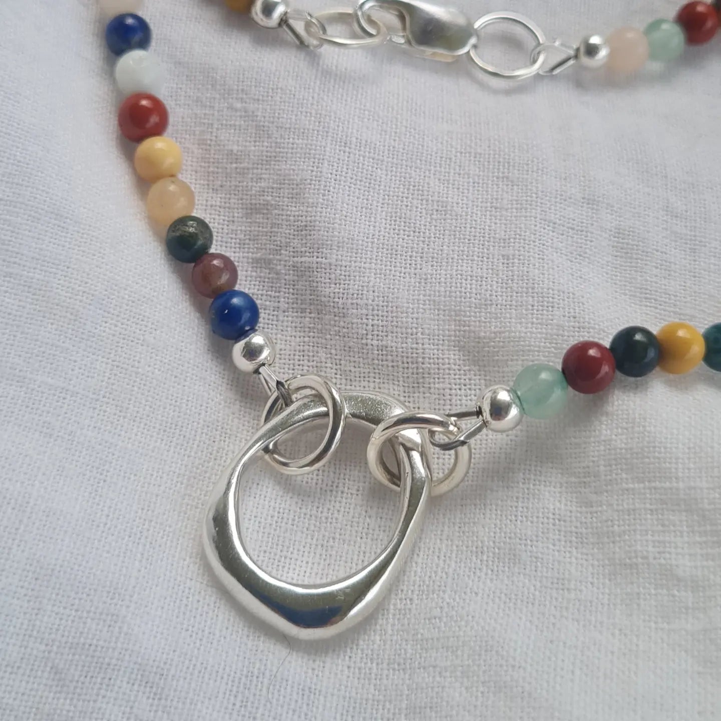 Sandcast organic sterling silver loop suspended between two silver loops, mixed semi-precious gemstones adorn this tinkling charm