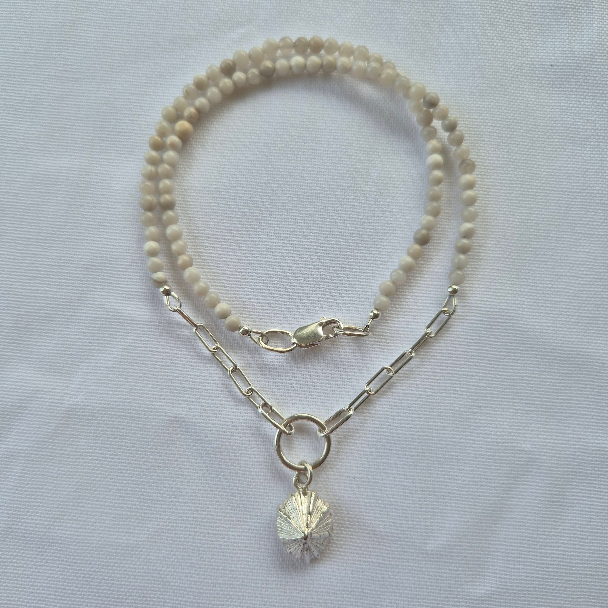 Sandcast Limpet shell in solid sterling silver, shell found off the shores of FNQ. Adorned with sterling silver chain and Crazy Lace Agate Gemstone Beads