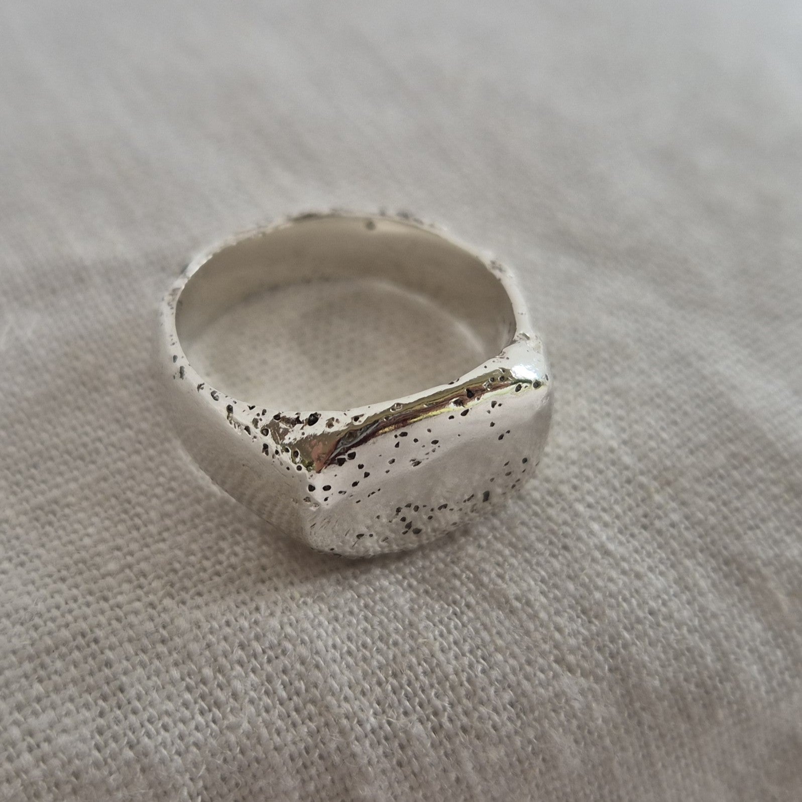 Sandcast in solid sterling silver using beach sand from Cairns, this signet ring features a softly polished surface with a light sand texture across the top. Each piece forms its own natural markings during casting, giving it a subtle, organic character.