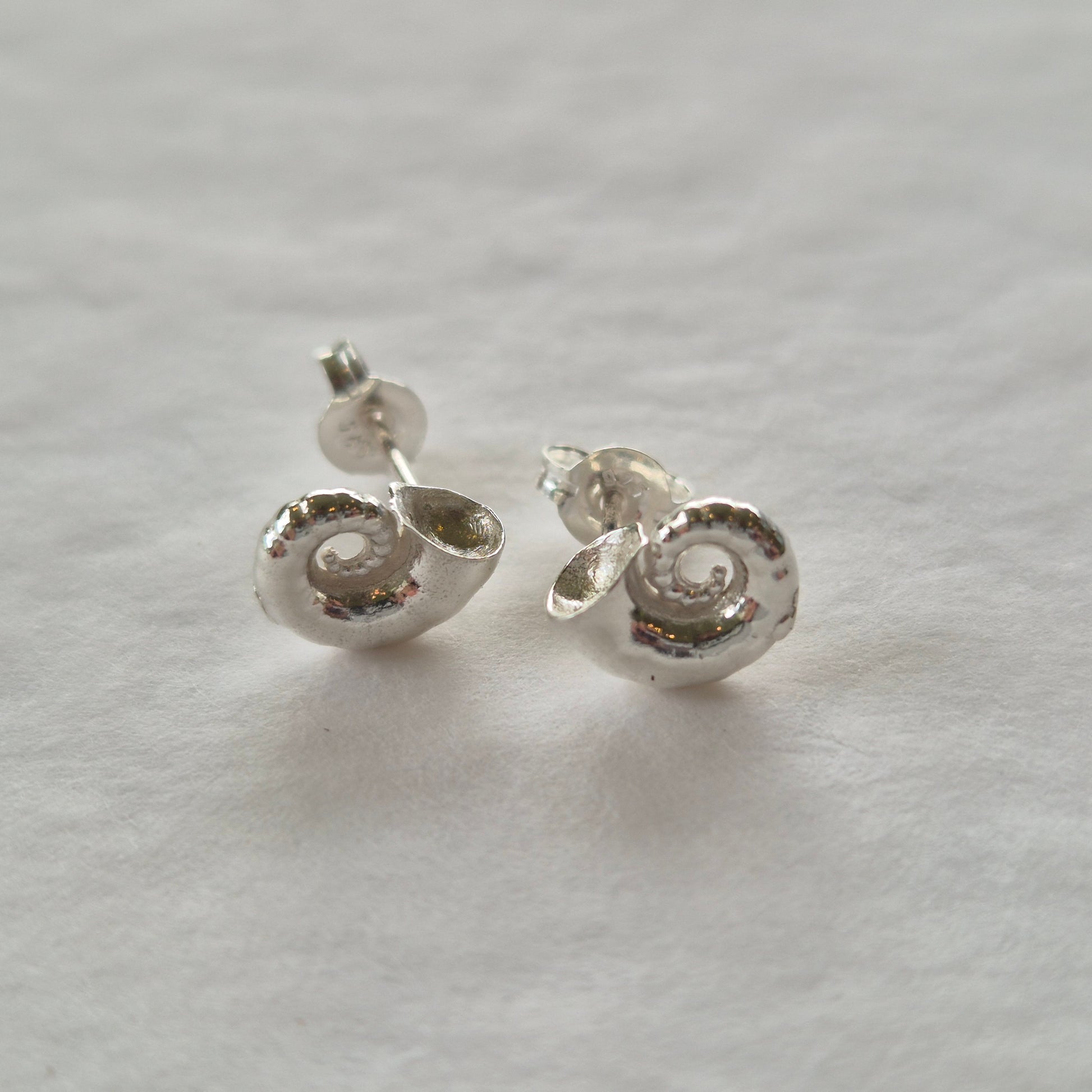 Handcrafted solid sterling silver studs featuring a unique spirula charm, cast from the spirula shell using the lost wax method. This shell was found washed on the shores of Mission Beach, Far North Queensland