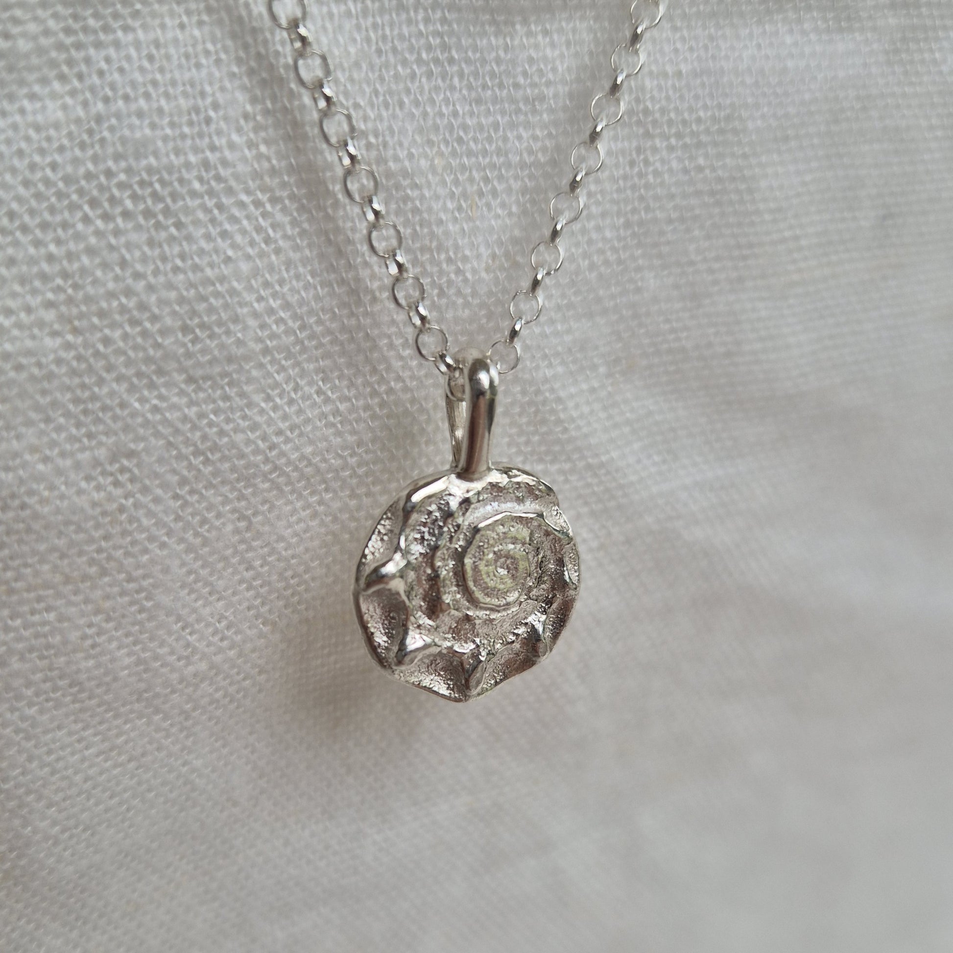 Sandcast in solid sterling silver from a mould I created using a spiked spiral shell found in Western Australia, this pendant captures the natural ridges and swirling form of the original shell. Its textured surface and organic shape make it a striking coastal keepsake with a sculptural feel.