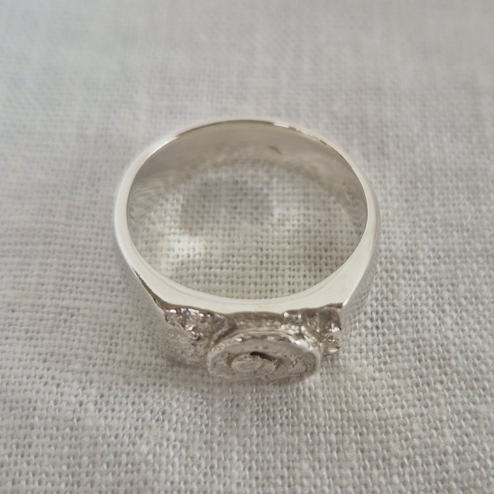 Cast in solid sterling silver using the lost-wax method, this signet ring features a unique spiral shell impression across its rectangular top. The organic markings come directly from the original shell, giving the piece a natural, one-of-a-kind character.
