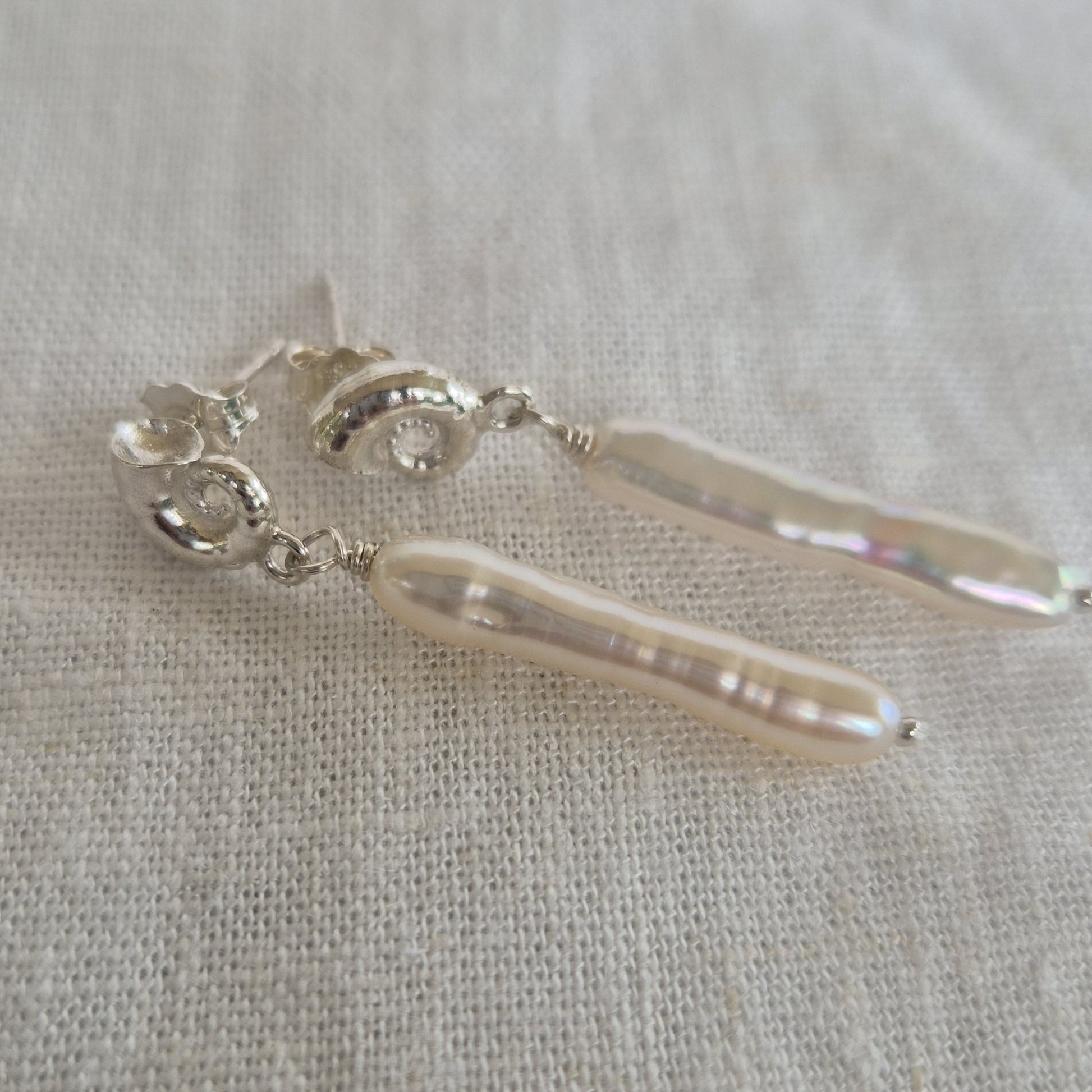 Handcrafted in solid sterling silver, these studs feature a spirula shell charm cast from a real shell found at Mission Beach, paired with beautifully iridescent freshwater pearl sticks. A unique mix of coastal form and natural lustre.