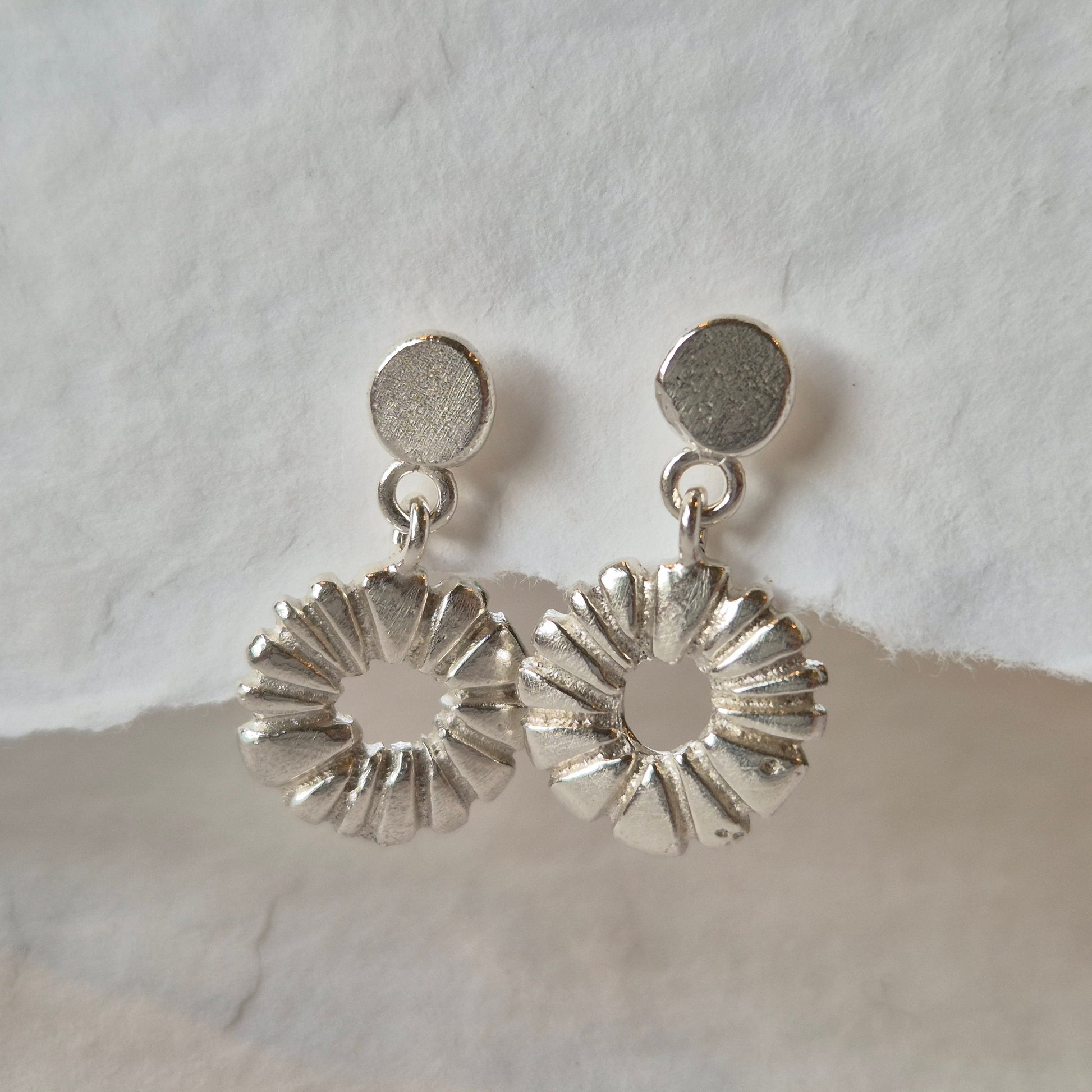 Sandcast sunburst in solid sterling silver, each one individually cast in sand from my garage workbench bench. Attached to a sterling silver studs these have some lovely movement to them.