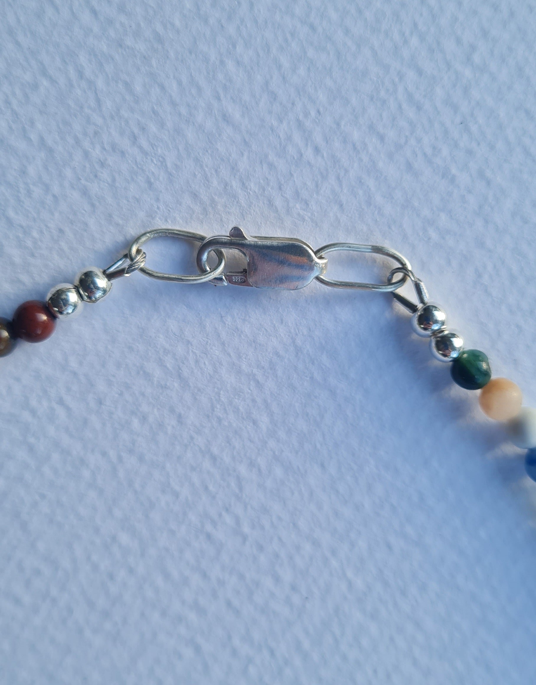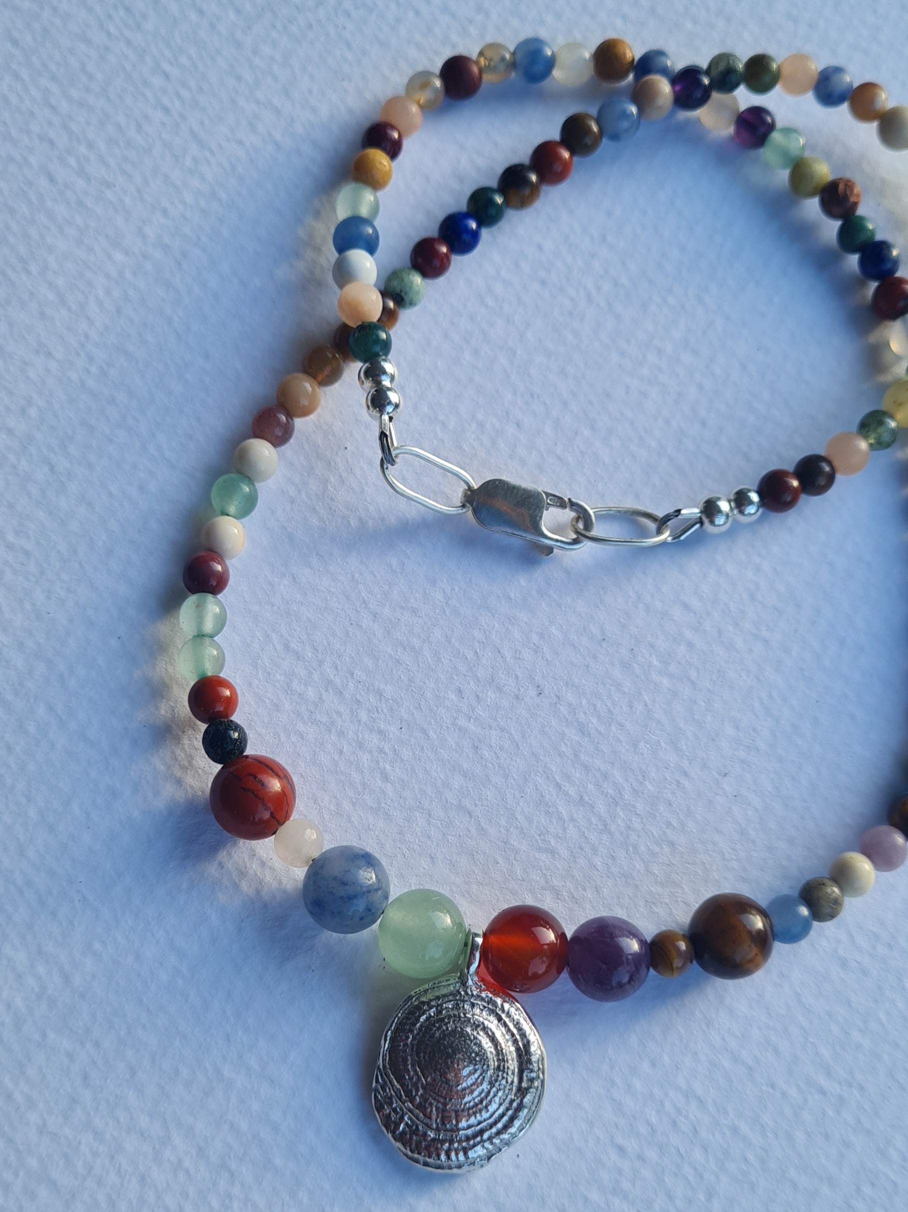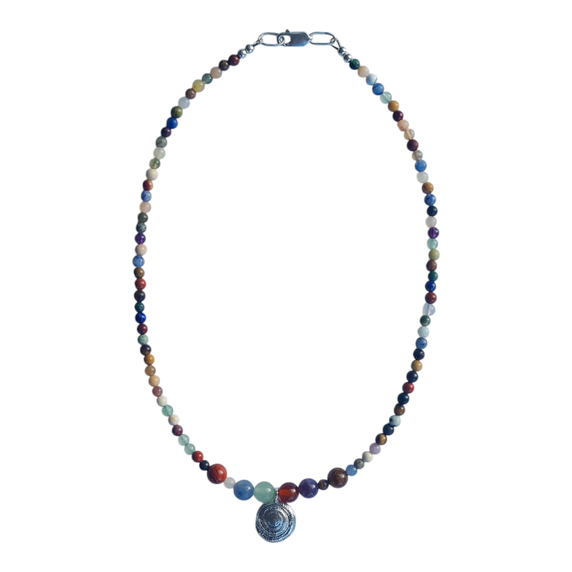 The pendant hangs on a vibrant strand of 4mm and 6mm mixed semiprecious gemstones, including a variety of stunning stones such as Red Jasper, Howlite, Rose Quartz, Sodalite, Clear Quartz, Jade, Tiger Eye, Lapis Lazuli, Dragon Bloodstone, Zebra Jasper, and Map Jasper.