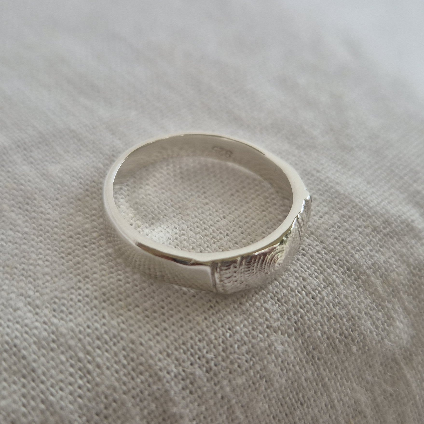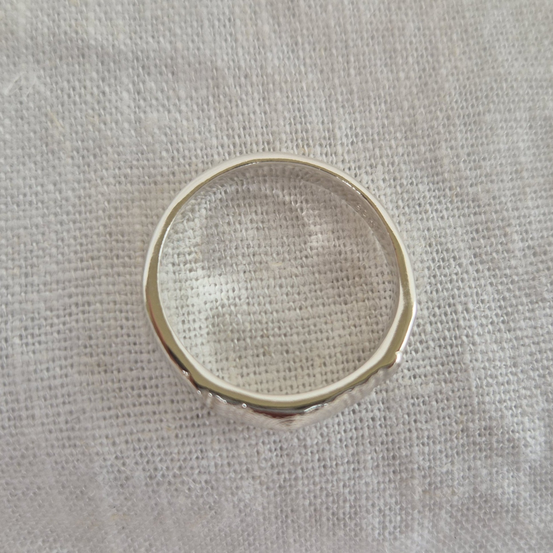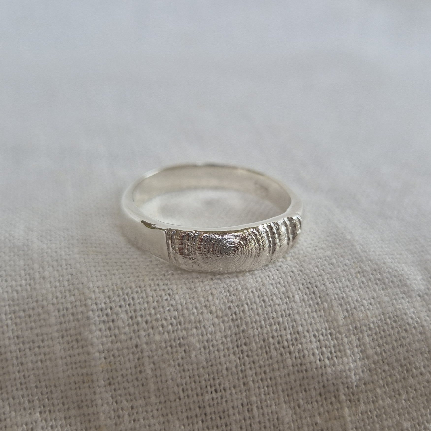 Cast in solid sterling silver using the lost-wax method, this ring features a subtle sundial shell impression across the top. Its soft, organic contours come from the hand-carved wax and casting process, giving each piece a naturally formed character.