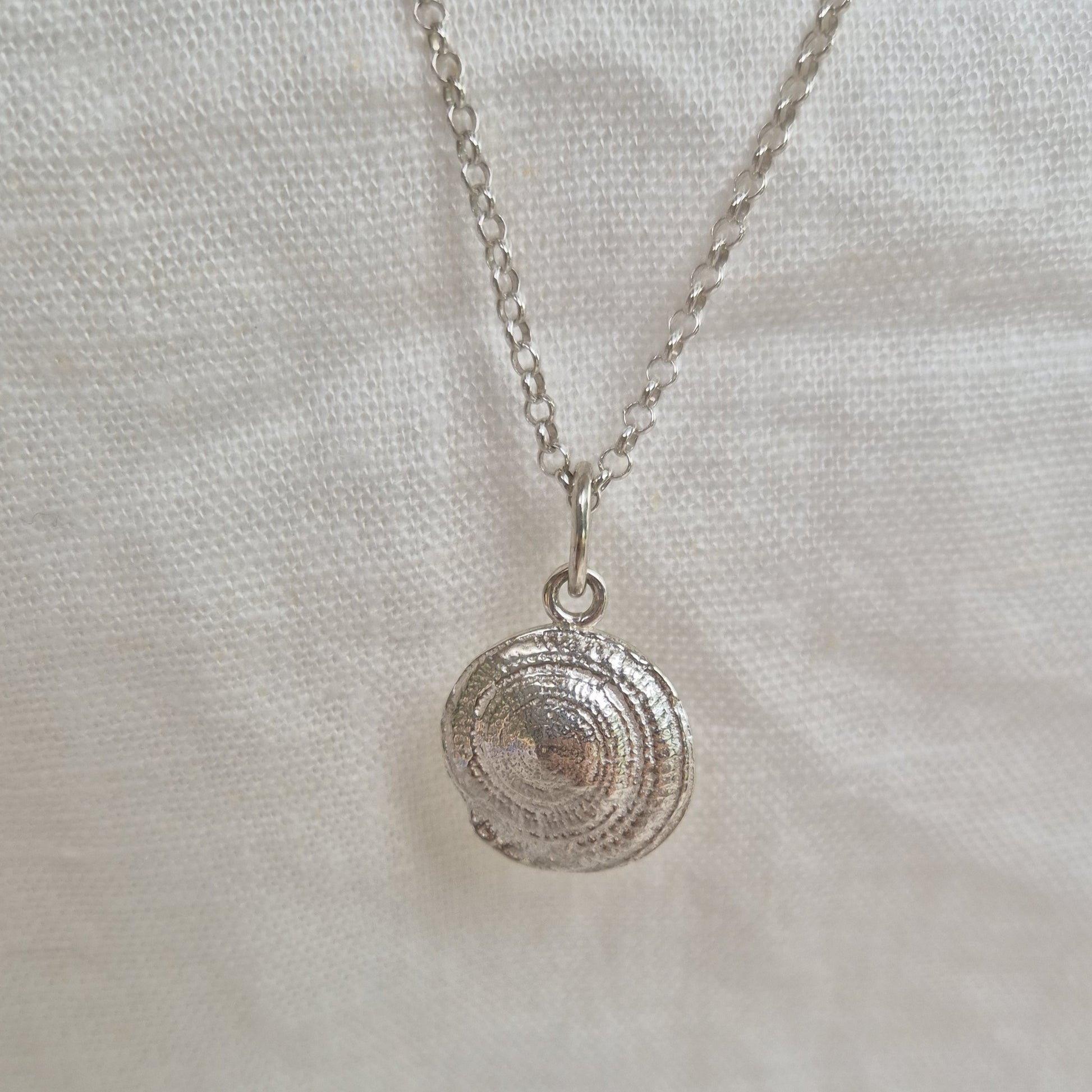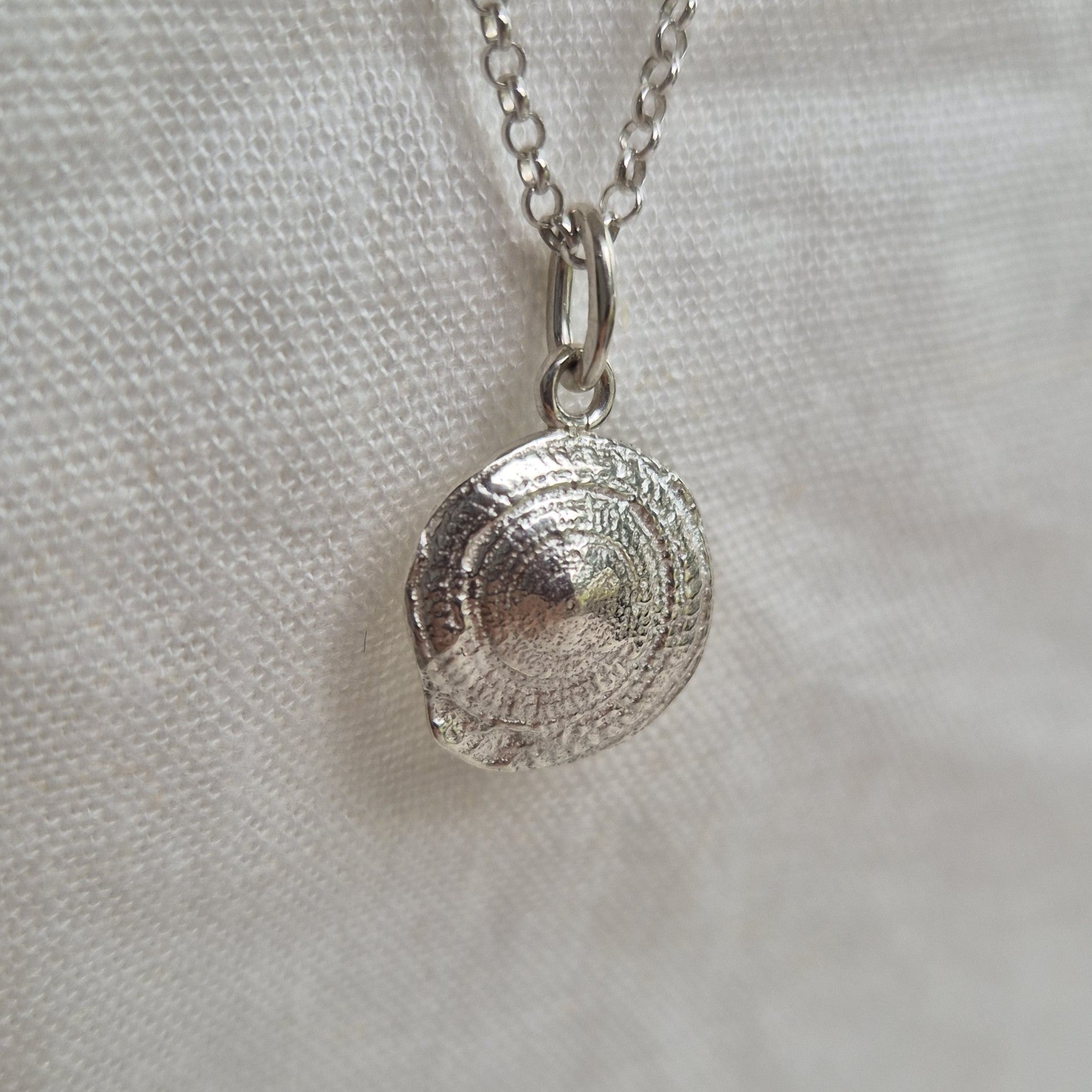 Sandcast in solid sterling silver from a mould created using a sundial shell, this medallion-style pendant showcases the natural spiral and layered pattern of the original shell. Bold yet refined, it carries an organic coastal texture with a smooth, sculptural finish.