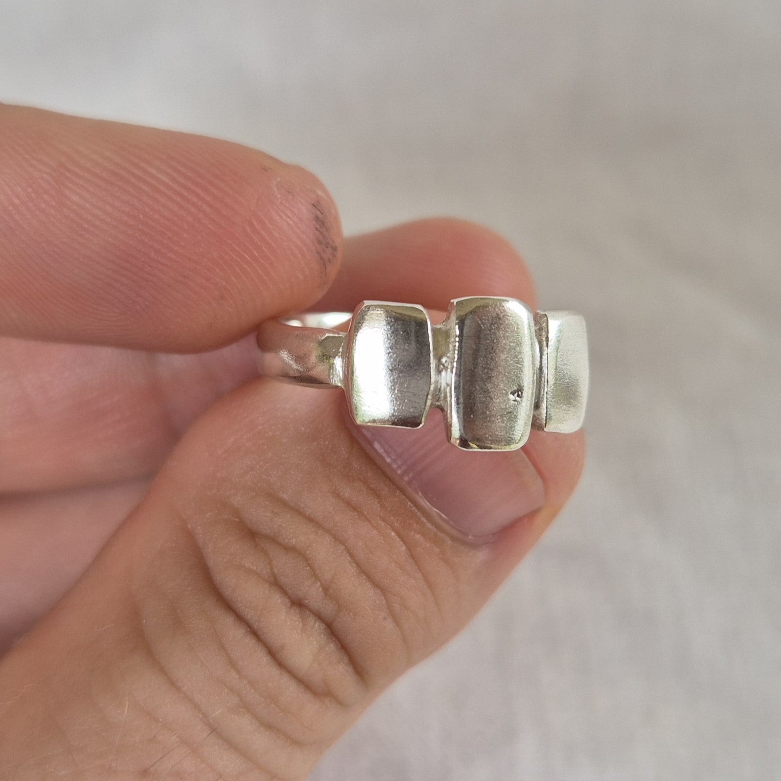Sandcast in solid sterling silver, this ring features a three-tiered rectangular top with an organic, relic-like form created naturally through the casting process. Soft edges and subtle surface variations give it a timeless, weathered character.