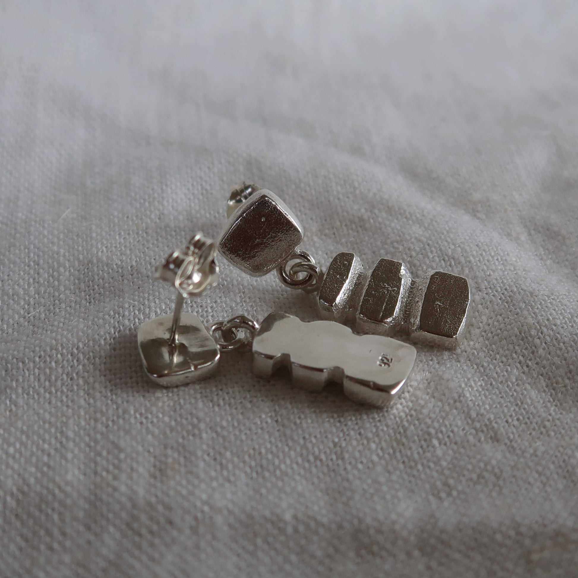Sandcast in solid sterling silver, each earring is individually formed from a hand-carved mould at my garage workbench in Cairns. Attached to sterling silver studs, they have a gentle movement and a softly textured surface that catches the light.